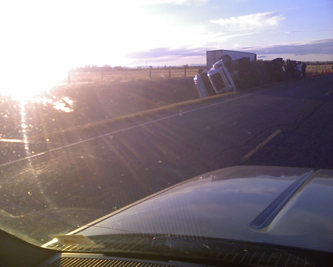 - 4:27 p.m. Semi truck over turned- almost to Shelby. Oh my.